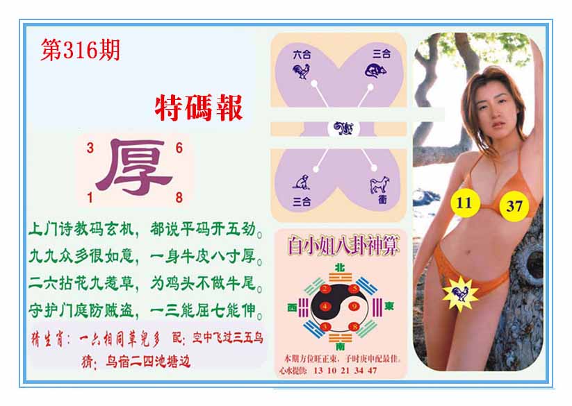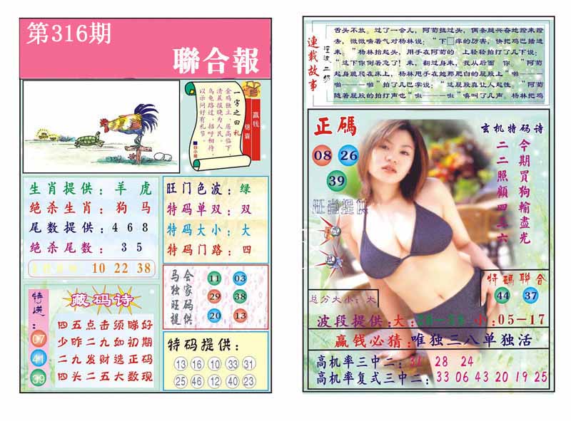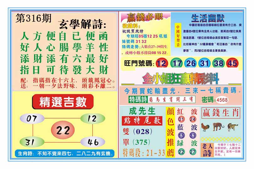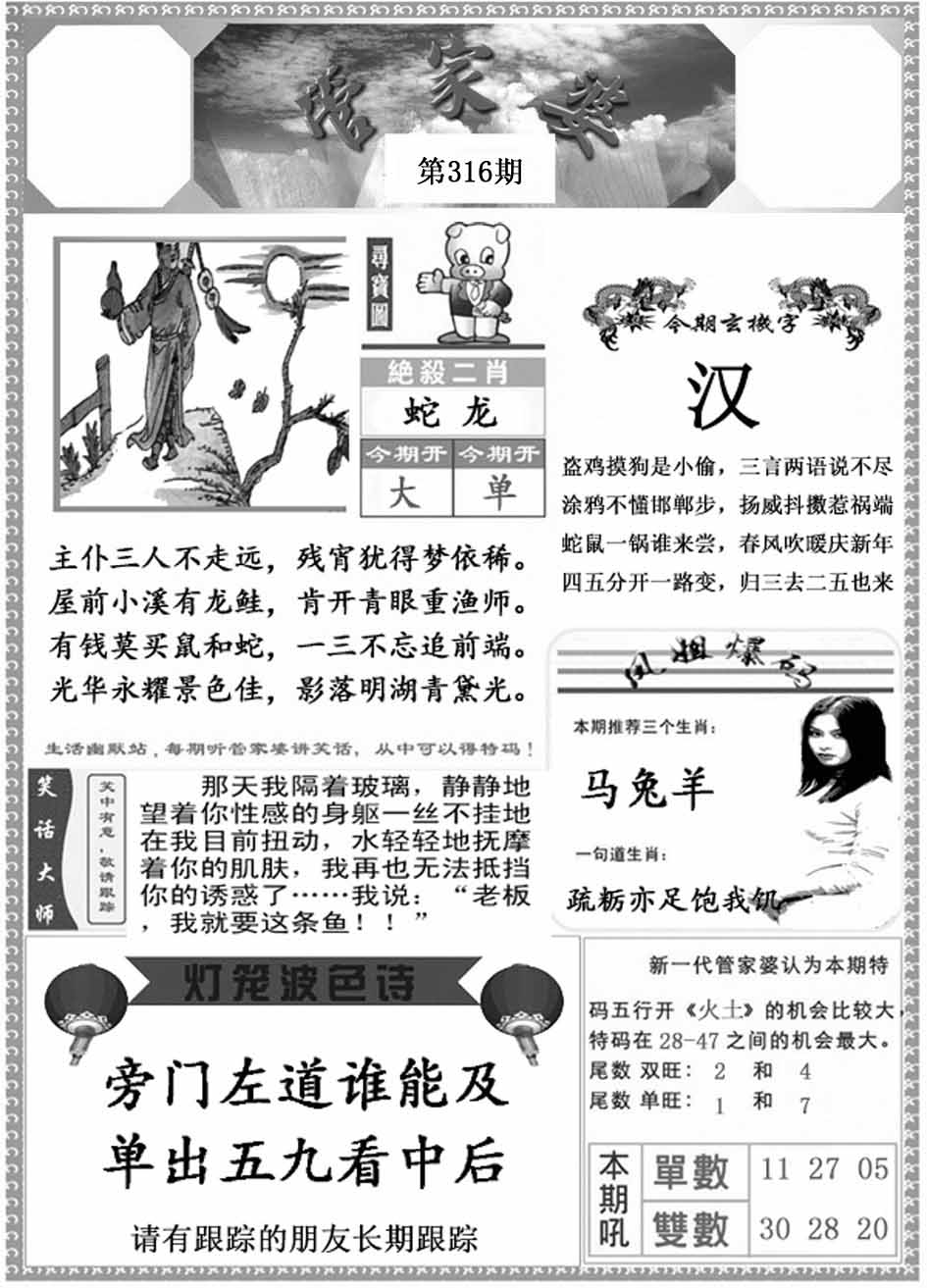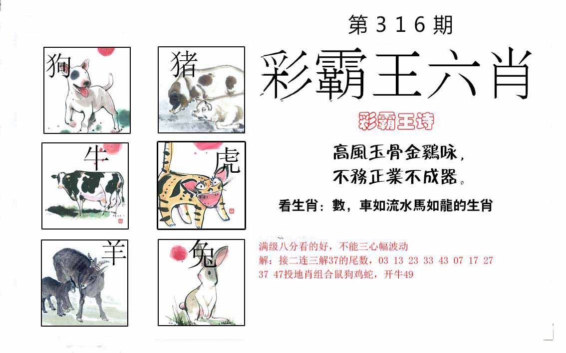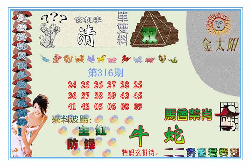 316期必中⑤肖: 蛇狗猪羊鸡 |