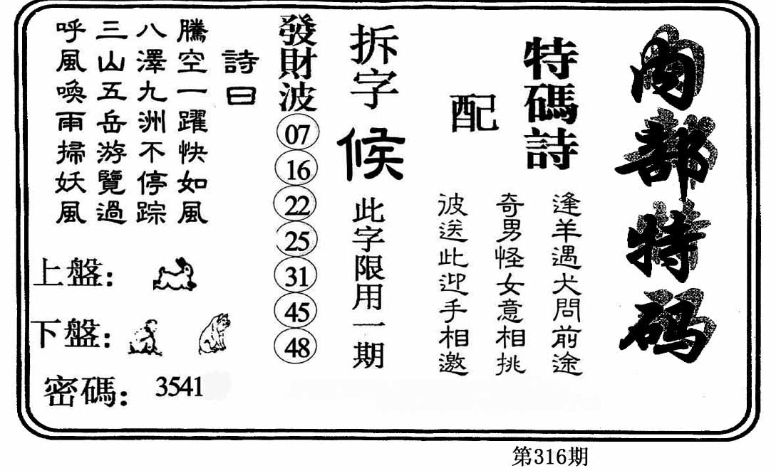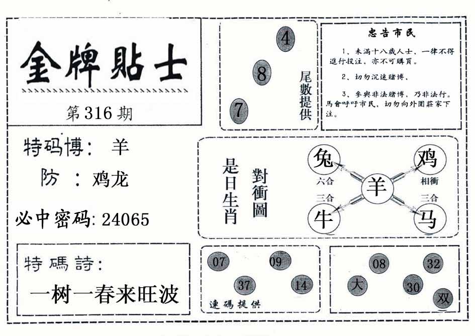 316期:九肖中特→马龙鼠牛猴羊兔猪虎 316期:七肖中特→马龙鼠牛猴羊兔 316期:六肖中特→马龙鼠牛猴羊 316期:五肖中特→马龙鼠牛猴 316期:四肖中特→马龙鼠牛--開?00 316期:必中单双→双 |